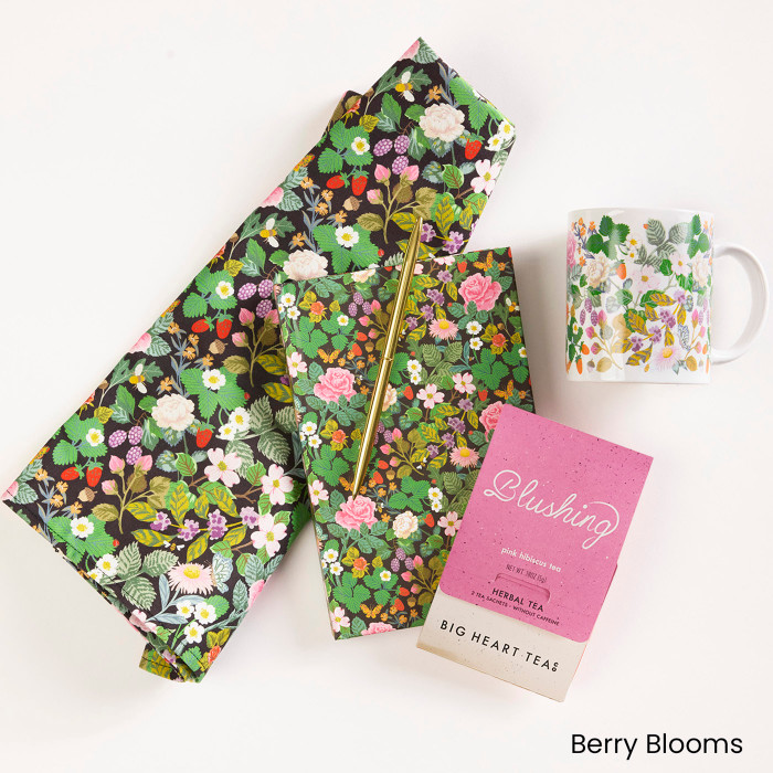 Berry Blooms is a Helmsie pattern ripe for picking, with beautiful berries and vibrant florals for a fresh spring feeling any time. Includes a matching Helmsie designer journal, pen, mug, and tea towel, plus two sachets of Blushing Tea from Big Heart Tea.